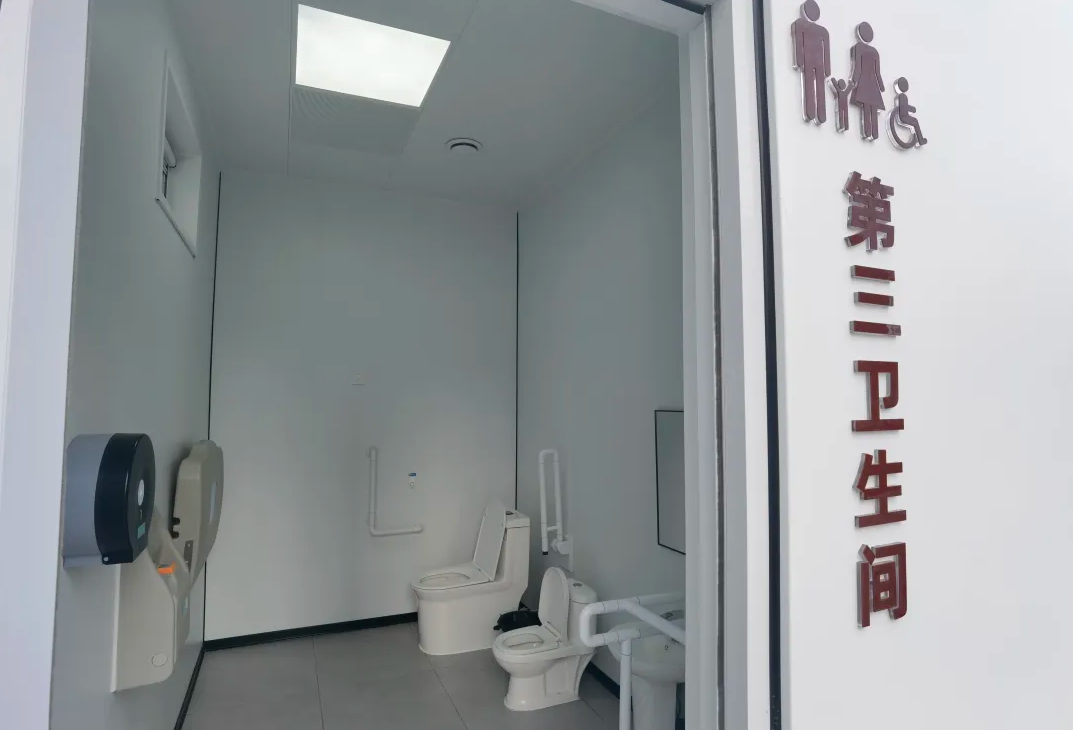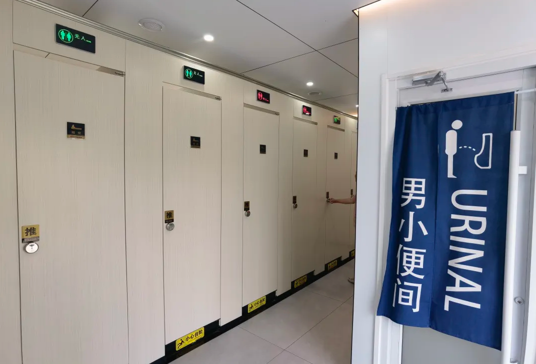 每座公厕设有7个厕位间、1个小便间及独立第三卫生间,配备空调、有无人提示、语音播报等智能设备,无障碍扶手、紧急呼叫按钮和防滑坡道,全方位满足不同人群需求。此外,化粪井与化粪车无缝连接设计,彻底解决了异味溢出问题,让公厕告别“脏、乱、差、臭”。旅客赵师傅经常来天津,他说:“这个公厕特别方便,又凉快又干净,还有插头可以充电,天津站的环境真是越来越好了!”